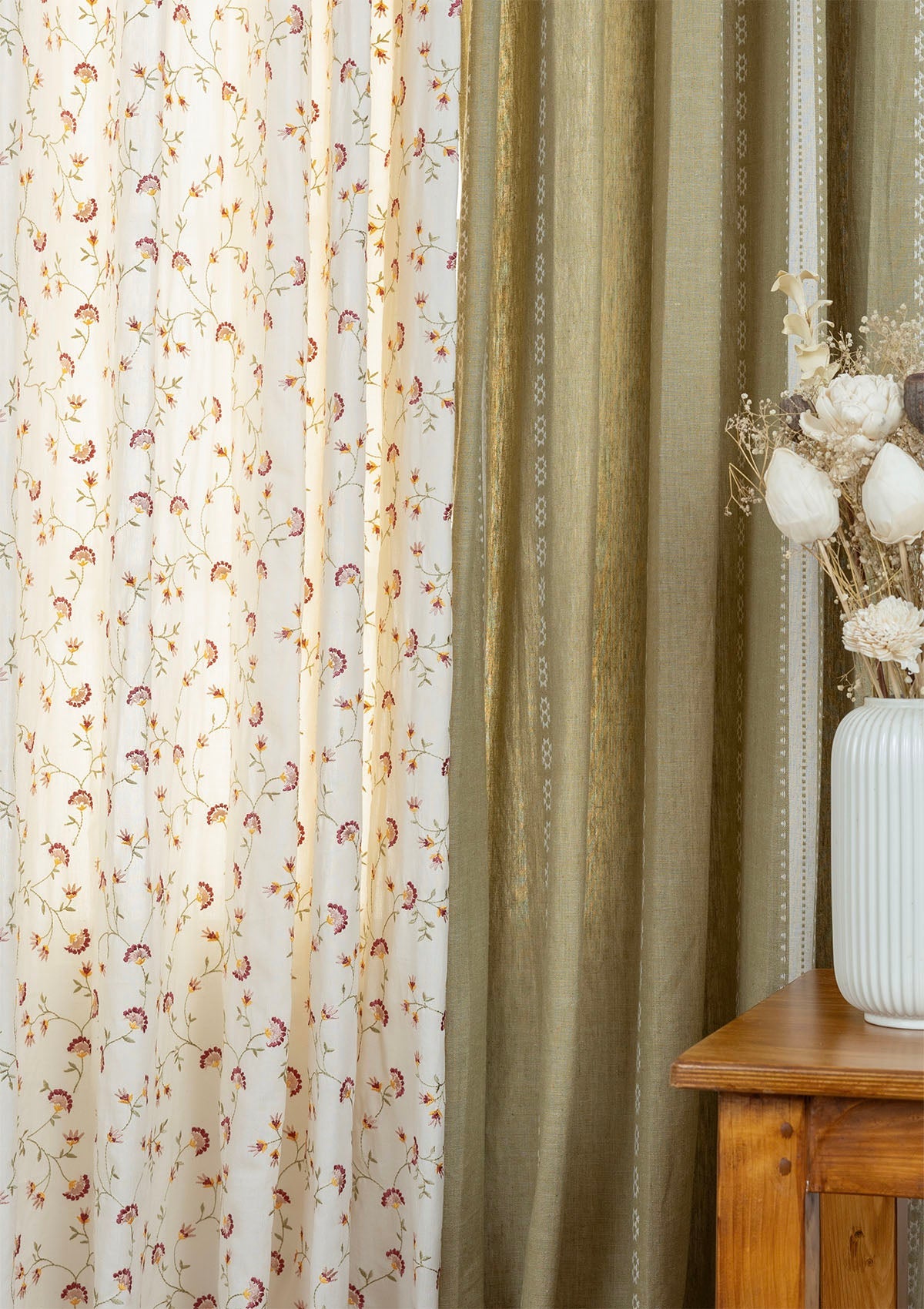 This elegant combo curtain set of 4 pairs refined minimalism with playful charm, perfect for living room or bedroom window and door curtains. Bhumi, the subtle green woven linen curtain brings quiet sophistication and royal charm, while the soft cream floral embroidered cotton curtain, Vaanya adds delicate blooms, movement, and a gentle diffusion of light. Together, they create a versatile, balanced look that refreshes any contemporary or traditional interior with elegance and warmth.