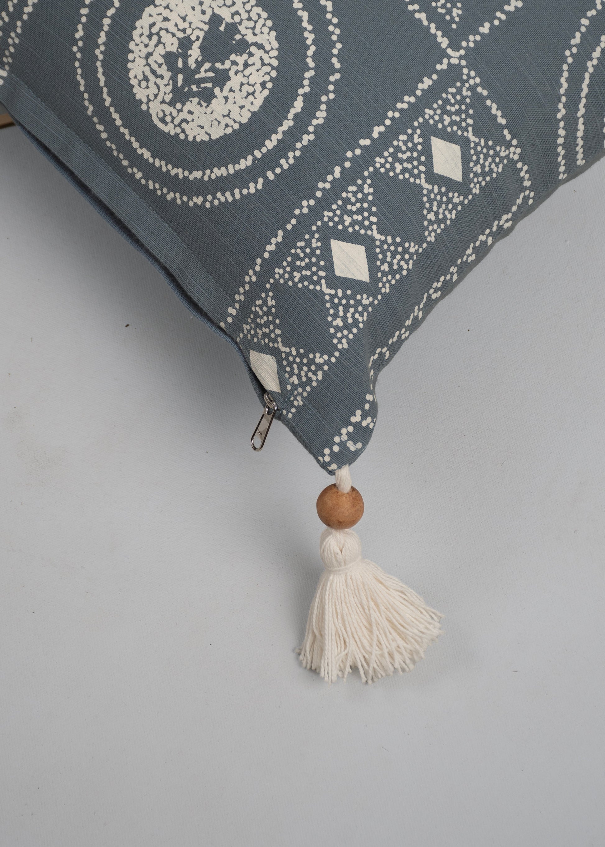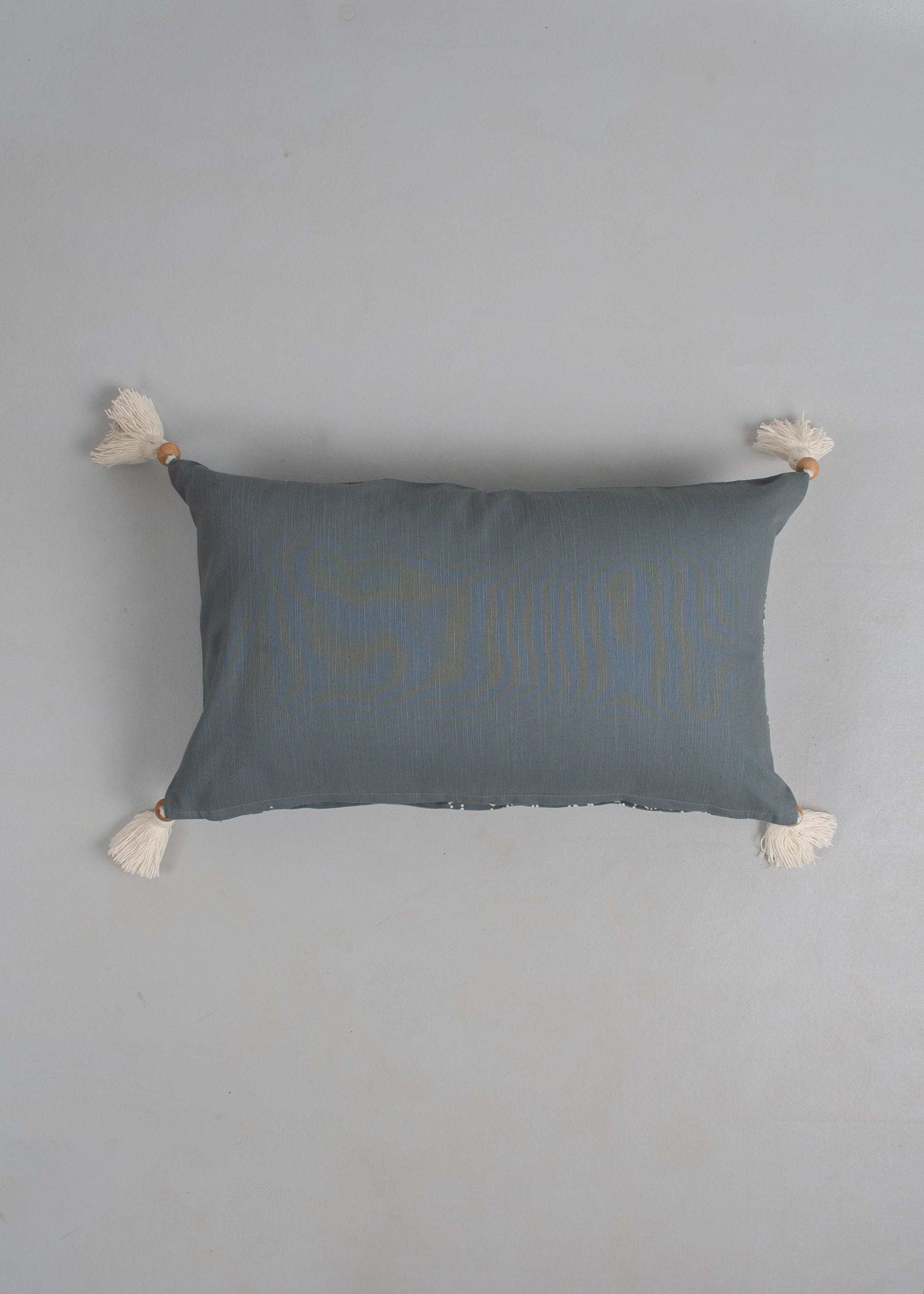 Bring home a touch of quiet artistry with this decorative cushion cover for sofa in a toned-down blue hue, featuring an abstract geo-floral print and finished with thoughtfully crafted wooden bead tassel detailing—a subtle statement piece with soulful charm. Pair this cotton cushion cover up with our whisper cushion cover to create a complementing set.