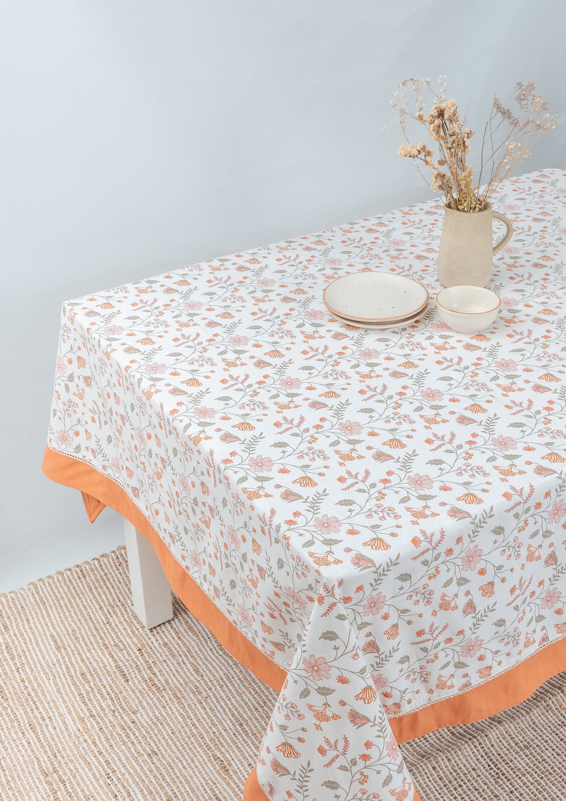 Introducing to you our beautiful floral printed table cloth of the season, The forest bloom. This multicolor print is easy on the eye, uses pleasant colors like apricot, rust and grey. This premium 100% cotton table cloth comes with a solid apricot orange border with a lace, is sure to enhance your dining table.