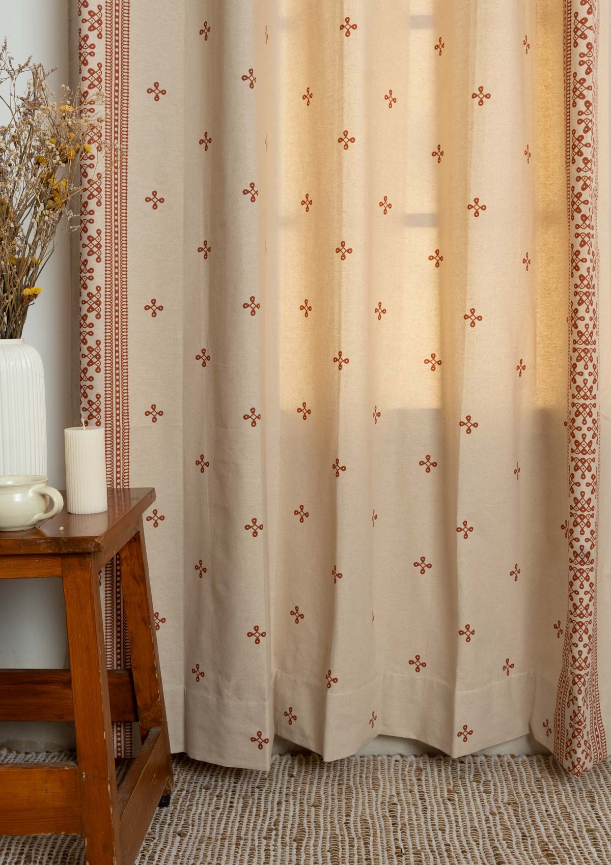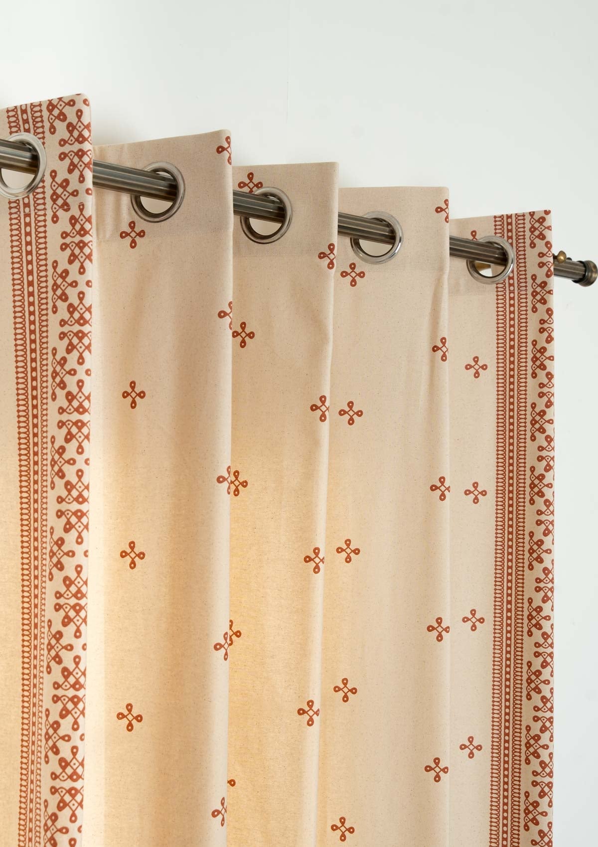 Perfect for neutral lovers, our printed Kolam Curtain combines minimalism with a touch of festivity. Inspired by the ethnic art of kolam, this curtain features a striking print in rich brick red, accented by an intricate border that adds a subtle yet sophisticated flair. Crafted from 100% premium cotton, Its simple, elegant design brings a warm, celebratory feel to any space, making it a versatile choice for both everyday use and special occasions for your living room or bedroom.