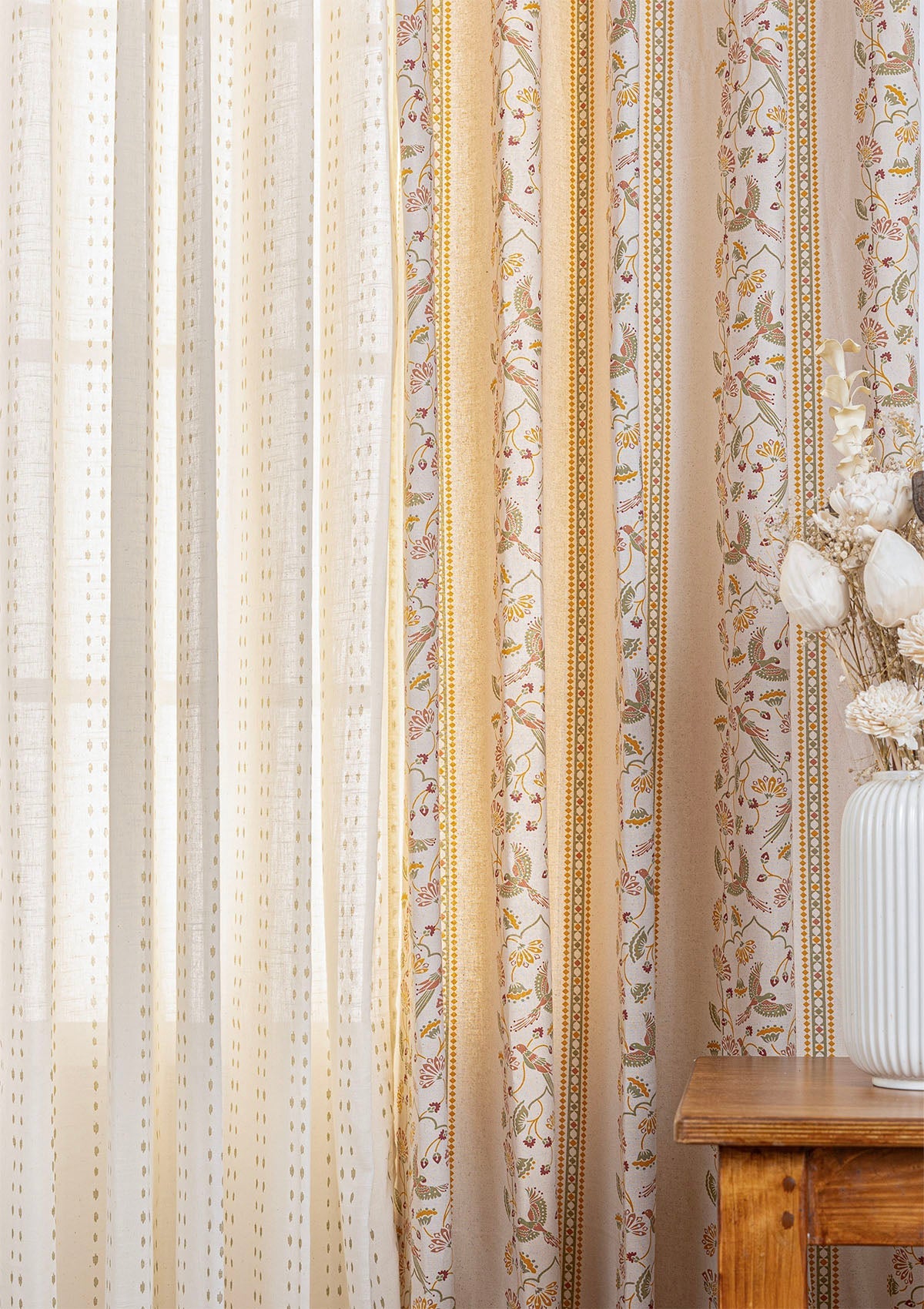 Elevate your home with this combo curtain set of 4, perfect for living room or bedroom window and door curtains. The Meenakshi cotton curtain features a soft neutral base with delicate pastel stripped floral motifs, blending heritage charm with modern elegance. Paired with the Dew herb green sheer, adorned with a subtle geometric print, the set adds breezy sophistication and a calm, layered look that refreshes any space.