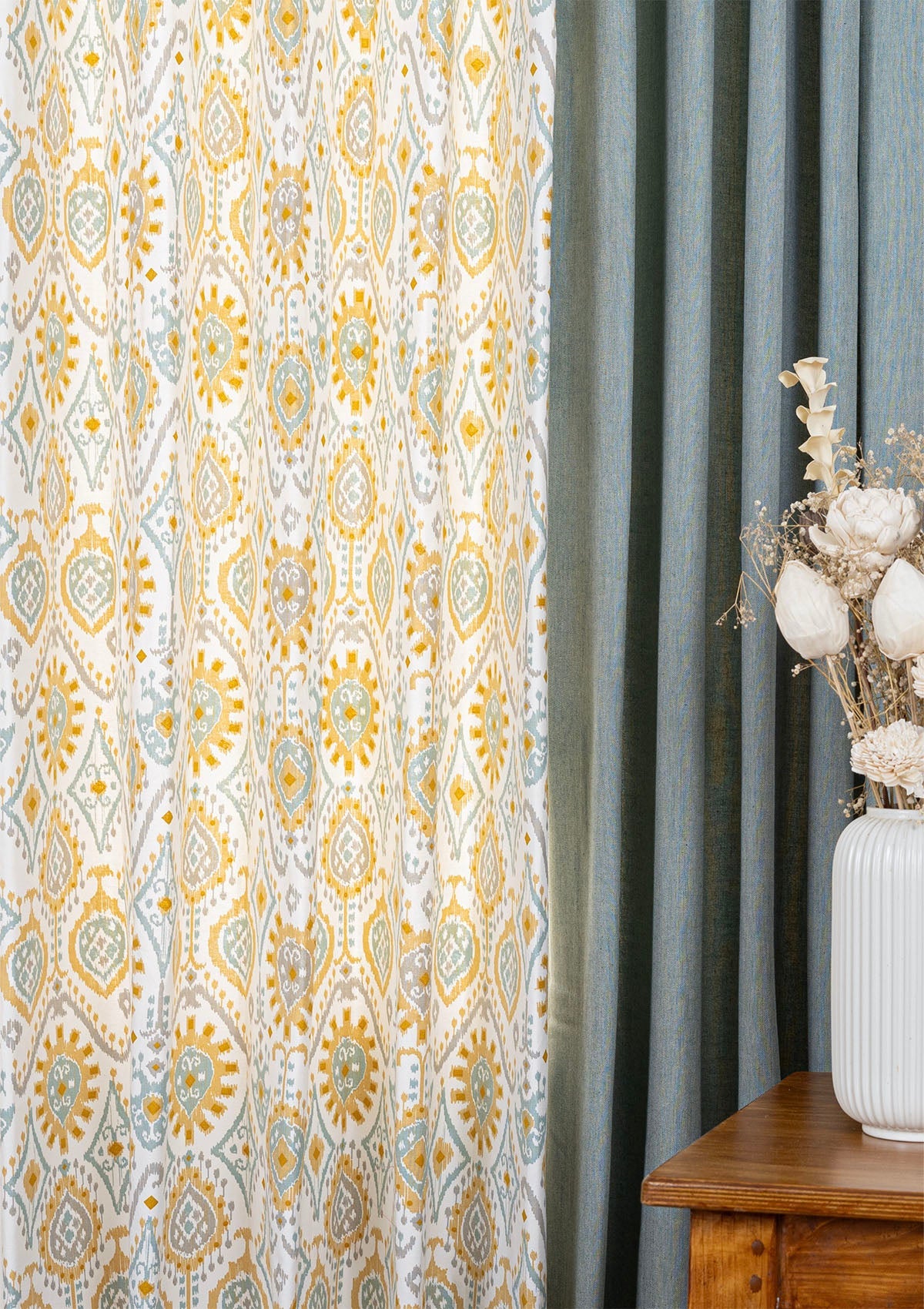 Refresh your home with this combo curtain set of 4, perfect for living room or bedroom windows and doors. The woven linen curtain in soothing blue-green adds depth and airy calm, while the ikat-printed cotton curtain brings vibrant global artistry with modern geometric patterns. Together, they create a serene yet lively, elegant, and stylish interior.