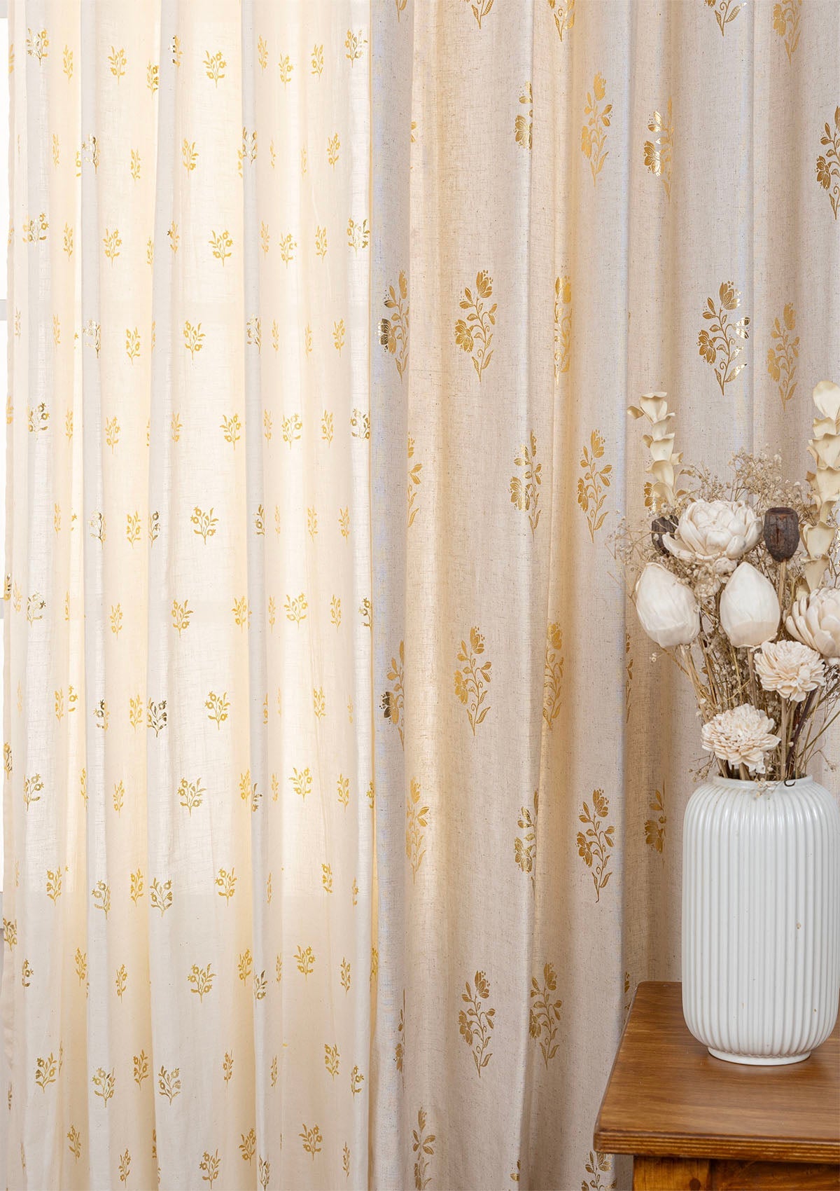 Bring timeless elegance and festive charm with this combo curtain set of 4, perfect for living room or bedroom windows and doors. The floral linen curtain with gold-printed motifs adds a serene, royal touch, while the breathable cotton curtain with gold-foil geo-floral prints brings playful movement and lightness. Together, they balance sophistication with joyful detailing, creating an inviting, stylish, and serene interior.