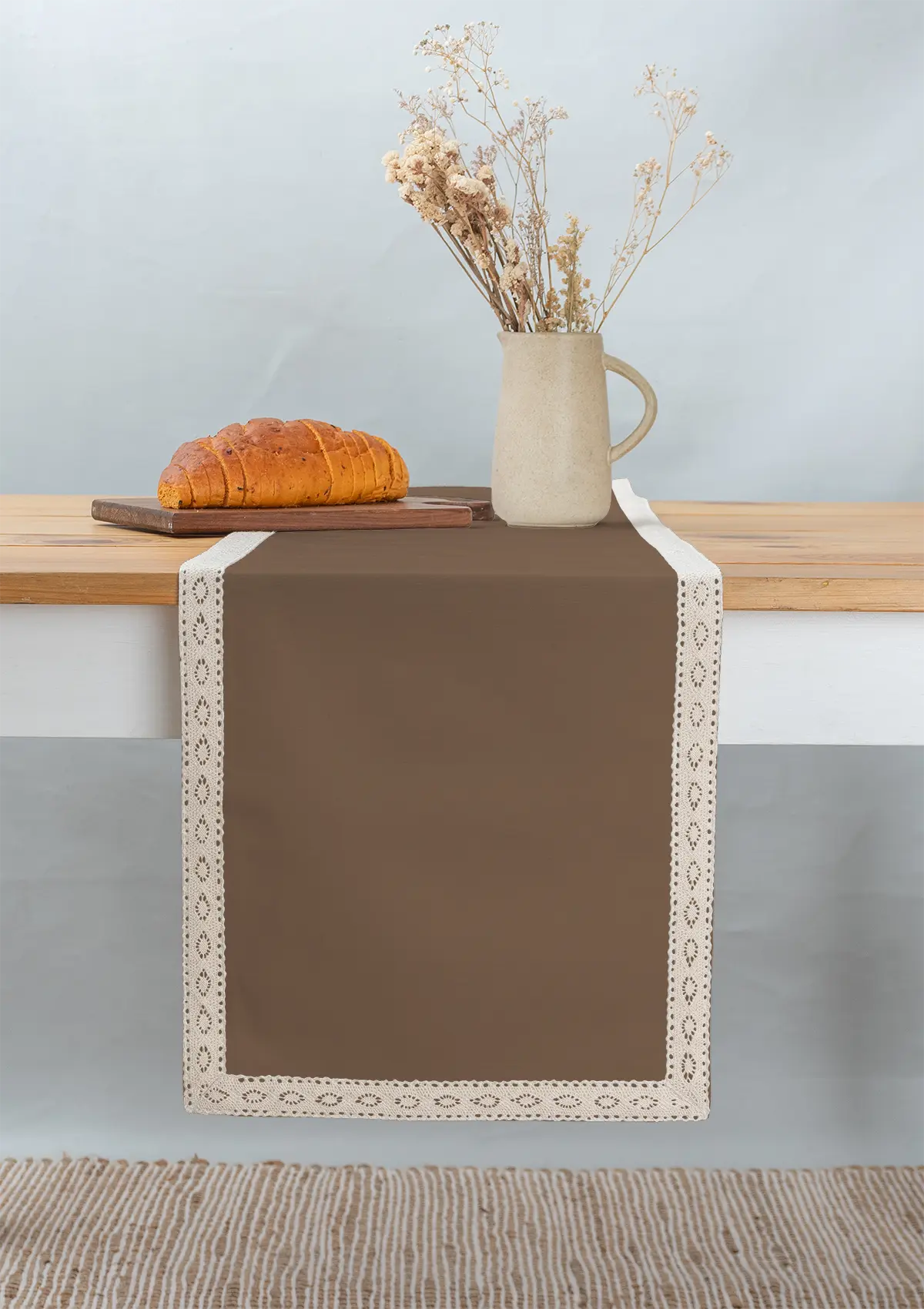 Solid chocolate brown 100% cotton plain table runner for 4 seater or 6 seater dining with lace border