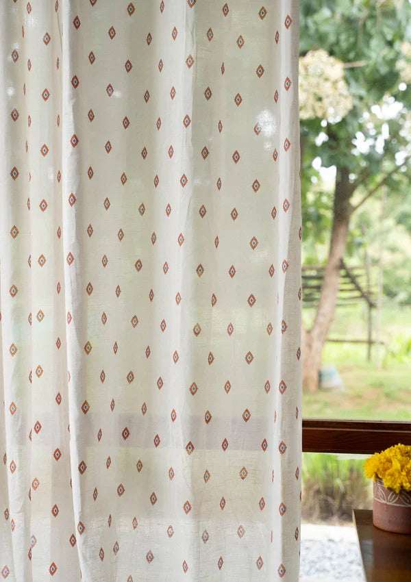 Refresh your home with this combo curtain set of 4, ideal for living room or bedroom windows and doors. The Tara cream cotton curtain, with its bold Ajrakh-inspired geometric border, adds handcrafted richness, while the Noor sheer features delicate printed buta motifs that softly filter daylight. Together, they balance heritage charm with understated sophistication, creating a warm and inviting interior.